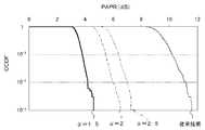 図10は、シミュレーションしたベースバンド信号のPAPRのCCDF特性を示す図である。横軸はPAPR(単位:dB)、縦軸はPAPRのCCDFである。従来技術のPAPRのCCDF特性が細い実線のグラフである。本実施の形態においては、入力信号dの各要素に上記(2)式で表される演算を施し、データ系列として各要素の絶対値が1であるCAZAC系列を用い、FFTサイズを4096としてシミュレーションを行った。上記(2)式におけるβ=1とし、αの値を変えた。本実施の形態においてα=1.5とした場合が太い実線のグラフ、α=2とした場合が一点鎖線のグラフ、α=2.5とした場合が二点鎖線のグラフである。いずれの場合においても、本実施の形態に係る発明のPAPRは従来技術と比べて低減されている。 FIG. 10 is a diagram showing the CCDF characteristics of the PAPR of the simulated baseband signal. The horizontal axis is PAPR (unit: dB), and the vertical axis is PAPR CCDF. It is a thin line graph of CCDF characteristics of PAPR of the prior art. In the present embodiment, each element of the input signal d is subjected to the calculation expressed by the above equation (2), a CAZAC sequence in which the absolute value of each element is 1 is used as a data sequence, and an FFT size is set to 4096. Went. In the above equation (2), β = 1 and the value of α was changed. In this embodiment, α = 1.5 is a thick solid line graph, α = 2 is a one-dot chain line graph, and α = 2.5 is a two-dot chain line graph. In any case, the PAPR of the invention according to the present embodiment is reduced as compared with the prior art.