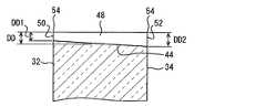図4では、溝44に沿った方向の断面を図示することにより、溝44の深さDDが示されている。溝44の深さDDは、突起前面50側において最小であり、突起後面52側において最大となって、その間では突起前面50から突起後面52に向かって漸次増大している。具体的には、最大である突起後面52側の溝44の深さDD2が50μm以下に設計されている。なお、本実施形態においては溝44が水平面に対して斜めに形成されているが、溝44が水平面と平行に形成されていてもよい。  In FIG. 4, the depth DD of the