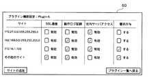 図4において、複数のプラグインのうち、プラグインAの機能設定情報が示されている。配信先は「サイト」として示されており、各配信先毎に、「SSL通信」、「動作ログ記録」、「社内サーバアクセス」、「署名付与」の各機能の有効/無効が設定される。 FIG. 4 shows function setting information of plug-in A among a plurality of plug-ins. The delivery destination is indicated as “site”, and each delivery destination is set to enable / disable each function of “SSL communication”, “operation log recording”, “in-house server access”, and “signature assignment”. .