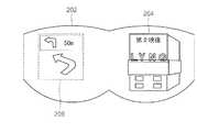 また、図2を参照すると、着用者が広告映像を提供するファーストフード店に到達するための案内データがスマートデバイスを通じて受信され得る。このために、スマートデバイスから広告メッセージの座標情報が受信されたら、データ連動部は着用者の現在位置の情報及び広告メッセージの座標情報を利用して着用者が現在位置から座標情報に対応する位置まで到達するように案内するための案内データを受信することができる。ディスプレイ部は、図2の案内画面206のように案内データをウェアラブルメガネ202にディスプレイすることができる。  In addition, referring to FIG. 2, guidance data for a wearer to reach a fast food restaurant that provides an advertisement image may be received through a smart device. For this reason, when the coordinate information of the advertisement message is received from the smart device, the data link unit uses the information on the current position of the wearer and the coordinate information of the advertisement message, so that the wearer corresponds to the coordinate information from the current position. It is possible to receive guidance data for guiding the user to reach the destination. The display unit can display the guidance data on the