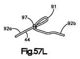 第1結節66aと第2結節66bとの間の距離Lは、標的の解剖学的位置24aと24bとの間の距離と同等かこれより短く、そのため、第1固定部22a及び第2固定部22bが解剖学的構造の後ろ側で拡張し補助ストランド33により接合される際に空隙24cが近接し、作動ストランド38a及び38bに含まれる張力は、空隙24cの近接を維持する。第1コネクタ部材63a及び第2コネクタ部材63bは、対応する結節66として構成され得るが、第1コネクタ部材63a及び第2コネクタ部材63bの一方又は両方が、別の方法で、本明細書において記載される任意の種類の任意の好適な固定部材63、又は任意の好適な別の方法で構成された固定部材として構成され得ることが理解されるべきである。例えば、コネクタ部材63a〜bの少なくとも一方又は両方が継ぎ目を画定する場合があり、対応する作動ストランド38a〜bは作動ストランド38a〜bの他方、又はこれ自体を通じて接合される場合があり、作動ストランド38a〜bの並進を阻止する圧迫力を適用するために、固定部22a及び22bの作動の後に、コネクタストランドに張力がかかる。  The distance L between thefirst nodule 66a and thesecond nodule 66b is equal to or shorter than the distance between the targetanatomical positions 24a and 24b, so that the first fixingpart 22a and the second fixing part Thegap 24c is in close proximity when 22b expands behind the anatomy and is joined by theauxiliary strand 33, and the tension contained in the workingstrands 38a and 38b maintains the proximity of thegap 24c. Thefirst connector member 63a and the second connector member 63b may be configured ascorresponding knots 66, although one or both of thefirst connector member 63a and the second connector member 63b are described elsewhere herein. It should be understood that any suitable fixingmember 63 of any kind being configured, or any suitable alternative configured fixing member may be configured. For example, at least one or both of theconnector members 63a-b may define a seam, and thecorresponding actuation strand 38a-b may be joined through the other of theactuation strands 38a-b, or itself, In order to apply a compression force that prevents translation of 38a-b, tension is applied to the connector strand after actuation of the securingportions 22a and 22b.