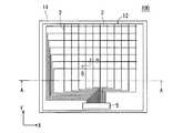 タッチパネル12は、投射容量方式のタッチパネルであり、ガラスやPET(polyethylene terephthalate)等で構成される透明基板上に、列方向(図1のY方向)に延在するように配置されたX位置検知用配線2と、X位置検知用配線2の上方に配設され、X位置検知用配線2と立体的に交差するように行方向(図1のX方向)に延在して配置されたY位置検知用配線3とで構成されるマトリクス配線を有した構成となっている。  The