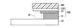 この現象を、図17を用いて模式的に説明する。図17に示すように下層配線30Bを形成した透明基板20上に液状の絶縁材を塗布した場合、庇状の透明キャップ膜33Bの下側の空間SP(図15)に絶縁材が充填されず、下層配線30Bの端縁部から透明キャップ膜33Bの上部にかけて充填不良部が発生する。このような現象を「膜はじき」とも呼称し、塗布不良領域が発生することとなる。This phenomenon will be schematically described with reference to FIG. When coated with liquid insulating material on the