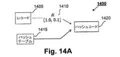 図14Aは、レコード1405及び点[1.0,  0.1]の形式の関連特徴ベクトル1410を示す。登録フェーズは、点及びハッシュテーブル1415の現在の状態の座標に基づいて特徴ベクトル1410に対するハッシュコード1420を生成する。図14Bは、ハッシュテーブル1415の生成されたハッシュコード1420と関連付けられるレコード1405を示す。図14Cは、クエリベクトル1425を一致させる点が使用するハッシュテーブル1415のハッシュコード1430、1440、1450を識別するために点[1.1,  0.0]の形式のクエリベクトル1425が使用されるクエリフェーズを示す。  FIG. 14A shows a