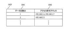 アクセス制御テーブル142Fは、データ交換ID1001と、アクセス許可アドレス1002と、を構成情報として有している。このテーブルは、図6によってアクセス設定された共有サーバとアクセス許可仮想マシンのアドレスを管理している。  The access control table 142F has a