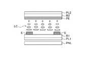 図2は、本実施形態の液晶レンズLZにおける電極構造を平面的にみた模式図であり、画像表示装置DPを観察者側から見た場合に対応している。第1基板B1上には、観察者から見て上下方向にそれぞれ延在して短冊状に形成される複数の電極(第1の電極E1)が配置される。また、第2基板B2上には、表示パネルPNLの表示領域に対応するように平板状に形成される第2の電極が配置される。したがって、本実施形態の液晶レンズLZでは、第1の電極E1及び第2の電極E2間に電界が印加されることで、シリンドリカルレンズ状のレンズ部を複数有したレンズアレイが形成される。また本実施形態では、レンズアレイにおける各レンズ部は、表示パネルPNL2列の画素列に対応するように形成される。なお、第1の電極E1としては、上下方向に延在する各電極が、液晶レンズLZの上部又は下部にて連結されて櫛歯状に形成されてもよい。 FIG. 2 is a schematic view of the electrode structure of the liquid crystal lens LZ according to the present embodiment when viewed in plan, and corresponds to the case where the image display device DP is viewed from the observer side. On the first substrate B1, a plurality of electrodes (first electrodes E1) each extending in the vertical direction as viewed from the observer and formed in a strip shape are arranged. A second electrode formed in a flat plate shape is disposed on the second substrate B2 so as to correspond to the display area of the display panel PNL. Accordingly, in the liquid crystal lens LZ of the present embodiment, a lens array having a plurality of cylindrical lens portions is formed by applying an electric field between the first electrode E1 and the second electrode E2. In the present embodiment, each lens portion in the lens array is formed so as to correspond to the pixel column of the display panel PNL2. In addition, as the first electrode E1, the electrodes extending in the vertical direction may be connected in the upper part or the lower part of the liquid crystal lens LZ to be formed in a comb shape.