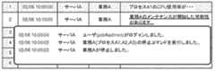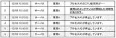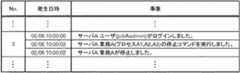 図5に、記録データ格納部103に格納されているデータの一例を示す。図5の例では、事象を特定するための番号と、事象の発生日時と、業務サーバの識別情報と、業務の識別情報と、発生した事象の内容等を表すメッセージとが格納されている。  FIG. 5 shows an example of data stored in the recording