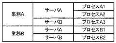 また、監視クライアント3におけるユーザは、図19に示すような表示によって、現在どの業務の監視をしているかを確認することもできる。図19の例では、業務の識別情報と、業務についての処理を担当する業務サーバの識別情報と、業務サーバにおけるプロセスの識別情報とが表示されている。  Further, the user in the