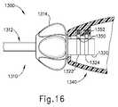 本実施例では、接点(1322、1324)は、シャフト(1320)に連結され、その周りに周辺方向に配設されたリング接点である。図16に示すように、バネ押し接点(1350)は、バネ(1352)によりシャフト(1320)に対して付勢される。エンドエフェクタ(1310)をハンドルアセンブリ(1340)の中に挿入し、長手方向に整列させると(本明細書に記載の連結機構の1つによるなど)、第1のバネ押し接点(1350)が対応する接点(1322)に電気的に連結し、第2のバネ押し接点(1350)が別の対応する接点(1324)に電気的に連結する。したがって、エンドエフェクタアセンブリ(1310)のエンドエフェクタは、ハンドルアセンブリ(1340)に対してエンドエフェクタアセンブリ(1310)が回転された場合でもバネ押し接点(1350)と接点(1322、1324)との電気的連結により電力を供給され得る。一部の変形では、付勢された板バネ接点をバネ押し接点(1350)の代わりに使用してもよい。 In this embodiment, the contacts (1322, 1324) are ring contacts connected to the shaft (1320) and disposed around the shaft (1320). As shown in FIG. 16, the spring-loaded contact (1350) is biased against the shaft (1320) by the spring (1352). When the end effector (1310) is inserted into the handle assembly (1340) and aligned longitudinally (such as by one of the coupling mechanisms described herein), the first spring-loaded contact (1350) is supported. The second spring-loaded contact (1350) is electrically connected to another corresponding contact (1324). Thus, the end effector of the end effector assembly (1310) is electrically connected between the spring-loaded contact (1350) and the contacts (1322, 1324) even when the end effector assembly (1310) is rotated relative to the handle assembly (1340). Power can be supplied by connection. In some variations, biased leaf spring contacts may be used in place of spring-loaded contacts (1350).