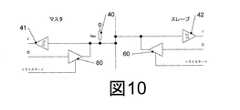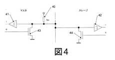 図4においては、マスタ側において、図2のトランジスタ21と同様に、トランジスタ43が、オープンドレインドライバとして、データラインと接地の間に設けられている。更には、プルアップ抵抗器40が、データラインと、例えば、VDDなどの正の電圧の間に設けられている。スライサ41が、マスタ側において、受信機として機能している。スレーブ側には、データラインと接地の間に、オープンドレイントランジスタ44が設けられている。更には、データを受信するべく、スライサ42も設けられている。  4, on the master side, like the