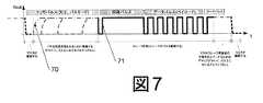 図7は、図6のシステムの例示用の信号を示している。トリガパルスは、図5を参照して説明したトリガパルスに対応しており、この場合に、マスタは、トランジスタ43を使用することにより、データラインをLowに駆動しており、これには、70によって示されているプルアップが伴っており、このプルアップは、抵抗性及び/又は静電容量性負荷によって左右され得る。その一方で、スレーブ側においては、この場合には、プッシュ−プルドライバが使用されており、この結果、例えば、図7の71によって示されているように、同期パルス、データパルス、及びポーズパルスにおいて相対的に鋭い立ち上がりエッジが得られる。図7においては、本質的に、スレーブの完全な送信は、図7の実線によって示されているように、プッシュ−プルドライバ60によって駆動される。  FIG. 7 shows exemplary signals for the system of FIG. The trigger pulse corresponds to the trigger pulse described with reference to FIG. 5. In this case, the master drives the data line low by using the