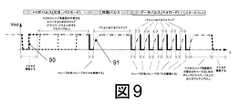 ギャップに続いて、スレーブの送信は、図5を参照して説明した送信に対応しており、この場合には、図5の52によって示されている立ち上がりエッジと同様に、立ち上がりエッジ91は、抵抗性及び静電容量性負荷に応じた波形及び立ち上がり時間を有し得る。 Subsequent to the gap, the slave transmission corresponds to the transmission described with reference to FIG. 5, in which case, like the rising edge indicated by 52 in FIG. It may have a waveform and rise time depending on the resistive and capacitive load.