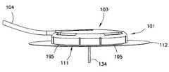 図1〜3に示すように、コネクタ103は複数の可撓性のアーム195を有し、可撓性のアーム195は、ベース111の外面内の対応する凹部196に係合するように適合される。コネクタ103からは管材104が延びており、ポンプに接続するように適合される。管材104は、コネクタ103から下方へ延びる貫通部材または鋭利部材(図示せず)に接続され、管材104と貫通部材との間に流体経路が形成される。貫通部材は、図3に示すように、コネクタ103がベース111に接続されたときに隔壁172を貫通するように適合され、それによって管材104とカテーテル134との間に流体経路を形成する。  As shown in FIGS. 1-3, the