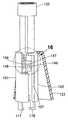 挿入器121は、図2、図4、および図10に示すように、ベース111に回転可能に接続された筐体またはダイヤル123と、ダイヤル123のベース122から上方へ延びるダイヤルポスト124と、ダイヤルポスト124に可動式に接続されたノブ125とを含む。ダイヤル123は、図2および図4に示すように、実質上切頭円錐形の形状を有する。ダイヤル123の壁126は、ダイヤルベース122から下方および外側へ延び、ダイヤルポスト124は、ダイヤルベース122から上方へ、ダイヤルベース122に対して実質上垂直に延びる。ダイヤルポスト124は、図12に示すように、互いから隔置された3つの実質上弧状の部材181、182、および183をその上端部に含むことが好ましい。ダイヤルベース122から下方へは、第1のアーム191および第2のアーム193が延び、ダイヤル壁126内に配置される。図6に示すように、第1のアーム191および第2のアーム193上には、それぞれ第1の肩部192および第2の肩部194が形成される。図4〜6に示すように、第1のアーム191と第2のアーム193との間には、スロット197および198が形成される。スロット197および198により、カテーテルハブ131を下方へ動かすことが可能になる。図11および図15に示すように、アーム191および193に接続されたフック117および118が、ベース111によって受容される。フック117および118は、図11に示すように、ベース111の下面132に係合し、カテーテル134の挿入前にダイヤル121が引き込まれるのを防止する。  As shown in FIGS. 2, 4, and 10, the