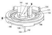 導入針142およびカテーテル134の挿入前、ベース111のスナップアーム106および107のフック108および109はロッキング部材161内の凹部162内に受容されており、それによってロッキング部材161が動くのを防止する。図11に示すように、ロッキング部材161から放射状に内方へ延びるタブ178および179がダイヤル123のフック117および118に係合しており、それによって、カテーテル134および導入針142が挿入される前に、ダイヤルがさらに回転して引き込まれるのを防止する。ばね部材171がカテーテルハブ131をベース111内の空胴116内へ引き込むと、図8および図9に示すように、カテーテルハブ131はベーススナップアーム106および107に係合して下方へ押す。ベーススナップアーム106および107が下方へ動くと、フック108および109がロッキング部材161内の凹部162から出て、それによってロッキング部材161およびダイヤル123を回転させることが可能になる。ここでカテーテル134および導入針142は、図10および図11に示すように、挿入部位内に挿入されている。  Prior to insertion of