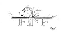 シリンダ1の回転と同時に、カバー5、ひいてはスクレーパ3が降下される。この動作は、例えば、シリンダ1のF1に沿う回転の方向とは反対の方向における、図3における矢印F4に沿う枢軸回動によって引き起こされる。カバー5の枢軸回動は、水平軸Bの周囲で実施される。図示されない一実施形態によれば、カバー5は、垂直並進移動によって降下させられる。シリンダ1およびスクレーパ3の移動の同期は、フィルム形成サイクルタイムを低減することができる。必要であれば、シリンダ1およびスクレーパ3の動作は時間とともにオフセットされる。Simultaneously with the rotation of the cylinder 1, the cover 5, and consequently the scraper 3, is lowered. This operation, for example, the direction of rotation along the F1 of the cylinder 1 in the opposite direction, caused by a pivot rotation along the arrow F4 in FIG. 3. The pivoting of the cover 5 is performed around the horizontal axis B. According to one embodiment not shown, the cover 5 is lowered by vertical translation. The synchronization of the movement of the cylinder 1 and the scraper 3 can reduce the film formation cycle time. If necessary, the operation of the cylinder 1 and the scraper 3 is offset with time.