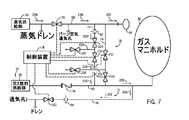 蒸気の一部は矢印252で示されるように蒸気パージ回路76に沿ってオフィリス82を横断する。蒸気は開いているバルブ220、222を通って蒸気パージ回路76に沿って継続して流れ、矢印254、256で示されるガス燃料ライン40への圧力降下が最小となる。上で言及したように、空気でガス燃料回路をパージする間、抽気バルブ218は開けられている。また、空気でガス燃料回路をパージする間、抽気バルブ226は閉じられている。したがって、液体燃料によるガスタービン14の運転中、蒸気は矢印258で示されるようにガス燃料ライン40に沿って流れてガス燃料システムのガス燃料回路(例えば、ガス燃料ライン40、燃料ノズル20、22、および、ガスマニホルド92)をパージする。蒸気でガス燃料回路をパージする間、蒸気によりガスライン40内で形成されるすべての凝結水を回収して排水するために、排水バルブ100は開かれている。蒸気は矢印260、262で示されるように排水ライン96に沿って流れる。排水ライン96に沿って配置されるオリフィス98は、バルブ100および通気領域に向かって流れる蒸気を制限する。蒸気流れを制限することにより、オフィリス98は蒸気の大部分がガスマニホルド92に向かって確実に流れるようにする。図6および7の設計では、パージシステム16は、ガス燃料システムのガス燃料回路を空気および蒸気により二重パージすることを可能にし、同時に、多重燃料ガスタービンエンジン14のパワー出力を増大させるために蒸気を使用することを可能にする。さらに、パージシステム16は、コーキング、ガス燃料ライン40および燃料ノズル20、22への燃焼生成物の逆流、ならびに、エンジンハードウェアの迅速な劣化を軽減するかまたは排除する。  A portion of the steam traverses the