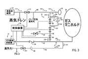 蒸気注入許容閾値が満たされた後で、パージシステム16(制御装置18を介する)は図3に示される第2の形態の運転に移行し、ここでは、空気の代わりに蒸気でガス燃料システムのガス燃料回路をパージする。蒸気注入許容閾値は温度と圧力の関数である。温度に対する蒸気注入許容閾値は約250℃から425℃または315℃から375℃の範囲であってもよく、圧力は約3500kPaから5500kPaまたは4170kPaから4500kPaの範囲であってもよい。例えば、パージシステム16は、約315℃、320℃、325℃、330℃、335℃、340℃、345℃、350℃、355℃、360℃、365℃、370℃もしくは370℃以上の温度または任意の別の温度、および/あるいは、約4170kPa、4200kPa、4250kPa、4300kPa、4350kPa、4400kPa、4450kPaもしくは4500kPa以上の圧力または任意の別の圧力で、第2の形態の運転に移行してもよい。  After the vapor injection tolerance threshold has been met, the purge system 16 (via the controller 18) transitions to the second form of operation shown in FIG. 3, where steam instead of air is used for the gas fuel system. Purge the gas fuel circuit. The steam injection threshold is a function of temperature and pressure. The steam injection tolerance threshold for temperature may range from about 250 ° C. to 425 ° C. or 315 ° C. to 375 ° C., and the pressure may range from about 3500 kPa to 5500 kPa or 4170 kPa to 4500 kPa. For example, the