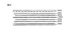 図10は、別々にされた、2層のストック微小複製微小導電体材料、及びポストプリントされた2層のインクジェット導電配線から構成されるマトリックスタッチセンサの実施例の断面図を示す。最上層1010は微小複製された微小導電体を含み、次の層1011は印刷された絶縁体であり、次の層1012は後処理された導電体を含み、次の層1013は、接着剤であり、次の層1014は、後処理された導電体であり、次の層1015は印刷された絶縁体であり、最後の層1016は、微小複製された微小導電体を含む。  FIG. 10 shows a cross-sectional view of an embodiment of a matrix touch sensor composed of two separate layers of stock microreplicated microconductor material and two layers of postprinted inkjet conductive interconnects. The