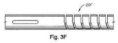 図3D〜3Gは、スロット付き先端20が、湾曲位置に逸らされた後に真っ直ぐな位置に弾性的に戻ることを可能とすべく、より高剛性のチップ材料が使用されうるスロット設計を示す。図3Dでは、カニューレ14の長さに沿って概して細長であるスロットが、浅い後部スロットに対向して設けられ、これは、スロット付き先端20Dを湾曲位置に逸らすのに必要とされる力を減少させる傾向がある。図3Eでは、スロット付き先端20Eが曲がることを可能とする連続的な螺旋状の切込みに後部スロット(この場合、鍵穴スロット)が散在しており、このことによって、スロット付き先端20Eは後部スロットの方向に曲がるようになる。図3Fは、螺旋経路が一方の側でスロット付き先端20Fの長手方向の軸線に垂直である螺旋状の切込みパターンを示し、このパターンによって、スロット付き先端20Fは、螺旋経路が垂直である側に向かって優先的に逸れるようになる。図3Gは、一方の側で選択的に拡げられた切込みを有する螺旋状の切込みパターンを示し、このパターンによって、スロット付き先端20Gは、螺旋状の切込みがより拡がっている側に向かって選択的に逸れるようになる。  3D-3G illustrate a slot design in which a stiffer tip material can be used to allow the slotted