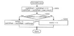 一方、サフィックス部分は、大きい差分ベクトルの下位ビットに対応する。したがって、取りうる値の範囲が大きく(例えば9〜1024)、二値化列のシンボルの発生頻度について偏りが小さい。そのため、シンボル発生確率を50%とみなし、バイパス符号化を行うことで処理量を削減する。つまり、サフィックス部分の復号ではバイパス復号(図4)を実行する。なお、差分ベクトルに正負符号が含まれる場合には、これに対してもバイパス符号化されるため、バイパス復号を実行する。 On the other hand, the suffix part corresponds to the lower bits of the large difference vector. Therefore, the range of values that can be taken is large (for example, 9 to 1024), and the deviation in the occurrence frequency of the binarized sequence symbols is small. For this reason, it is assumed that the symbol occurrence probability is 50%, and the amount of processing is reduced by performing bypass encoding. That is, bypass decoding (FIG. 4) is performed in the decoding of the suffix part. If the difference vector includes a positive / negative code, bypass coding is also performed on the difference vector, and bypass decoding is executed.