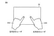 また、図2から理解されるように、ディスプレイ35に、操作者の左手(手202)で情報が入力される場合、入力に利用される指は、ディスプレイ35の左側から当該ディスプレイ35へと延びている。このため、この場合のある傾向として、操作者が意図したポイントよりも若干左寄りの位置で、指がディスプレイ35に接触するという傾向を挙げることができる。また、この場合の他の傾向として、ディスプレイ35のタッチセンサの検出出力が、ディスプレイ35と離間した位置における指やスタイラスペンの位置に影響を受け得るとき、タッチセンサにおいて検出されるタッチ位置はユーザが実際にタッチしようとした位置よりも左側にシフトするという傾向を挙げることができる。また、その際にはタッチしている部分より左側において、タッチセンサの検出出力分布に偏りが生じるという傾向を挙げることができる。  As understood from FIG. 2, when information is input to the