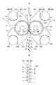 Further, as a representative position regulating structure of the scraping member 6, one or two scraping members 6 are provided to face the first or second bladed drums 4 and 5, and each bladed drum 4 is provided. In order to regulate the amount of biting into the recesses 5, 5, the position is regulated by two position regulating members 7 (in this example, 7 a to 7 d) with respect to the drums 4 and 5 with blades. In FIG. 1,