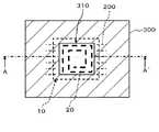 図1は、第1の実施形態における半導体装置の構成を示す断面図であり、図2は図1に示した半導体装置の平面図である。図1は図2におけるA−A´断面図に相当している。この半導体装置は、実装基板100、半導体チップ10、インダクタ20、及び封止樹脂層300を備えている。半導体チップ10はAgペーストやDAF(Die Attach Film)などのマウント材(図示せず)を介して実装基板100の第1面に配置されている。半導体チップ10は能動面を上に向けて配置されている。インダクタ20は能動面すなわち半導体チップ10のうち実装基板と対向しない面側に設けられており、半導体チップ10と外部との間の通信を行う。封止樹脂層300は実装基板100の第1面に形成され、半導体チップ10を封止している。また封止樹脂層300には凹部又は開口(本実施形態では凹部310)が設けられている。凹部310は平面視でインダクタ20を内側に含んでいる。平面視において凹部310の面積は、例えば封止樹脂層300全体の1%以上70%以下である。なお以下の各平面図において、封止樹脂層300のうち凹部310が形成されている領域にはハッチングを付していない。  FIG. 1 is a cross-sectional view showing the configuration of the semiconductor device according to the first embodiment, and FIG. 2 is a plan view of the semiconductor device shown in FIG. FIG. 1 corresponds to a cross-sectional view taken along the line AA ′ in FIG. This semiconductor device includes a