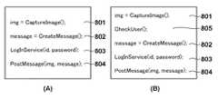 CaptureImage() API 801は、アプリケーション実行端末のカメラ機能を起動し、操作ユーザによるシャッター指示に応じて写真画像を撮影する。CreateMessage() API 802は、不図示のテキスト入力部によってユーザからのテキスト入力を受け付け、写真投稿サイトへの投稿メッセージを作成する。LogInService() API 803は写真投稿サイトのアカウント(ID)とパスワード(password)を使って写真投稿サイトにログインする。最後に、PostMessage() API 804はCaptureImage() API801及びCreateMessage() API802で取得された写真画像と投稿メッセージを、写真投稿サイトにアップロードする。 The CaptureImage ()