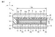着色層53、54、55は、ガラス基板21、遮光部51a、51b及び周辺遮光部52上に形成されている。着色層53、54、55は、行方向Xに沿って帯状に延在している。着色層53、54、55は、列方向Yに互いに隣接し、交互に並べられている。各着色層は、各行の複数の画素PXにのみ重なっている。着色層53、54、55の周縁部は、遮光部51aに重なっている。