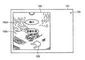 図4は、本実施の形態1にかかるコマンド実行処理における表示画像を説明する図であって、術者の手指が、タッチパネル42(表示部41)上においてBモード画像を表示する領域内に応じた位置に配置される場合に、表示装置5の表示部101に表示される画像を示す図である。例えば、術者の手指が、タッチパネル42(表示部41)上において人差し指を立てた状態で超音波画像表示部102の領域内に応じた位置にある場合、図4に示すように、術者の手指の画像(ポインタ200)が、タッチパネル42上の位置に応じて配置され、実行可能コマンド選択部35により選択されたコマンドに応じたコマンド画像102a,102bが、超音波画像表示部102上に表示されている。ここで、コマンド画像102aは、コメント入力モードを示すコマンド画像であり、コマンド画像102bは、カーソル入力モードを示すコマンド画像である。  FIG. 4 is a diagram for explaining a display image in the command execution processing according to the first embodiment, in which the surgeon's fingers are in accordance with the area in which the B-mode image is displayed on the touch panel 42 (display unit 41). It is a figure which shows the image displayed on the