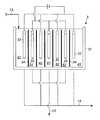 なお、陰極と陽極の間と陽極と陰極の間にて電解が生じるため、図2では、7枚の電極で挟まれた合計6のゾーン(電解槽)で電解が生じることになる。6つの電解槽はそれぞれ隔膜34で2つに仕切られているので、6つの電解槽は6つの陰極セルと6つの陽極セルからなっている。An electrolyzed