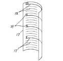 このシール17をエアートラップチャンバー3,7の筐体外周部に貼り付けると、図14(a)(b)と同様の状態となる。従って、このエアートラップチャンバー3,7の適正レベルまで生理食塩水等Pが入っている場合は、図15に示すように、液体の屈折により上記目盛線28が上記チャンバー7の凸状円柱面12a’側に立体的に目視することができ、また数字29は拡大されて目視されるので、当該エアートラップチャンバー7,3内の適正水位レベルW2,W1まで生理食塩水等Pが存在することを素早く認識することができる。  When this