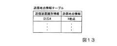 図13は、管理サーバ70が記憶する送信地点情報テーブルのデータ構成を示す図である。同図に示すように、送信地点情報テーブルは、送信装置10ごとに、送信装置識別情報と、送信地点情報とを関連付けた情報を含む。同図の送信地点情報テーブルには、送信装置識別情報“S1234”と、この送信装置識別情報により特定される送信地点情報 “X地点”とが含まれている。  FIG. 13 is a diagram illustrating a data configuration of a transmission point information table stored in the