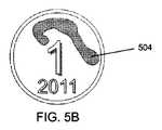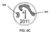 [0048]図5B及び図5Cを再度参照しながら図3を参照して、コインを登録する方法の一例を説明する。登録は通例、コインの製造後に政府機関によって行われる。例示的な登録方法では、コインの取得領域504のデジタル表現を生成した後、そのデジタル表現を識別子と関連付けて記憶する。識別子は、母型、パンチ、又はダイに対応する1つ又は複数の部分と、コインに対応する部分とを含むことができる。図5Cでは、取得領域504の部分領域の1つは、ダイに関連する表面の特徴の構成部分に対応し、取得領域504のもう一方の部分領域は、コインに固有の表面の特徴の構成部分に対応する。  [0048] An example of a method for registering a coin will be described with reference to FIG. 3 while referring again to FIGS. 5B and 5C. Registration is usually done by government agencies after coins are manufactured. In an exemplary registration method, after generating a digital representation of a