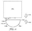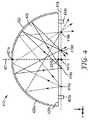 図9では、レンズ組立体912が、外部表面920a及び内部表面920bを有するレンズ部材920を含む。外部表面は、弓状境界構造925a、925bによって分割される。これらの境界構造は、1本以上の溝若しくは切り込み及び/又は1本以上の隆起部若しくは突起部であるか又はそれらを含んでよい。境界構造925aはおおむね、x−z平面に平行な平面内に存在し、境界構造925bはおおむね、y−z平面に平行な平面内に存在し、それゆえ、境界構造925aと交差する。外部表面920aの一部又は全てに二色性反射体が堆積されるか又は別様に取り付けられるが、境界構造925a、925bにおいては存在しなくてもよい。外部表面920aの分割は、図8に関して説明されたものを含む、いくつかの目的を果たすことができる。境界構造925a、925bの存在にもかかわらず、外部表面920aはなお、好ましくは、頂点921aにおいて外部表面920aと交差し、本明細書の別の箇所で説明されている集束又は結像特性を提供する対称軸又は光軸921を規定するように成形されている。  In FIG. 9, the
