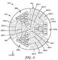 この平面図では、隣接LEDの群は、蛍光体層のくさび形部分640、642、644によって互いに分離される。更に、隣接LEDのそれぞれの群は、図の中心における点に対して、蛍光体層のくさび形部分のうちの1つのおおむね反対側となるくさび形領域内に存在する。LEDのくさび形領域、及び蛍光体層のその対応するくさび形部分のそれぞれの対は、図中の中心点に関しておおむね対称であってもよい。光軸が中心点を通過するように二色性反射体を構成することによって、かつ二色性反射体の好適な曲率半径を選択することによって、隣接LEDのそれぞれのくさび形群からのLED光の、二色性反射体によって反射される部分は、蛍光体層の対応するくさび形部分上に(少なくともおおむね)結像させることができる。3つのLED群のそれぞれの内部の隣接LEDは、中心点から(x−y平面に平行に測定して)異なる半径方向距離に配列されるようにも示されている。図示の配列では、例えば、それぞれの群内の1つのLED(LED  614a、614b、614c参照)は中心点に最も近接して配設され、それぞれの群内の3つのLED(LED  616a、616b、616c参照)は中心点から最も遠くに配設され、それぞれの群内の2つのLED(LED  615a、615b、615c参照)は中心点から中間の距離に配設されている。二色性反射体は、それぞれのLEDが蛍光体層の異なる小部分を第一に励起するように、各LEDからの少なくとも一部の光を蛍光体層の選択部分へと反射する。蛍光体部分640、642、644を、中心点から異なる半径方向距離にある小部分を含むものと見なせば、すなわち、部分640は小部分640−1、640−2、640−3、640−4を含み、部分642は小部分642−1、642−2、642−3、642−4を含み、部分644は小部分644−1、644−2、644−3、644−4を含むと見なせば、二色性反射体は、個々のLEDからのLED光を以下のように個々の蛍光体層の小部分上に優先的に反射してよい:
