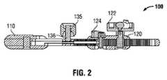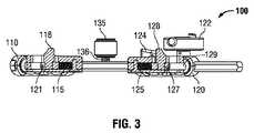 特に図1を参照して、各アーム130、132は、第1の支持体110に結合される。アーム130、132は、各アーム130、132の長さに沿って少なくとも部分的に延在するそれぞれのキャビティ133、134を画定する。アーム130のキャビティ133は、第2の支持体120の並進ノブ122に動作可能に係合する歯136を有する部分を含む。並進ノブ122は、並進ノブ122が回転すると、アーム130上の特定の場所に第2の支持体120を固定するように構成され適合される。さらに、各キャビティ133、134は、各キャビティ133、134内に並進的に配設されたロック用ホイール135、137を収容するように構成され寸法決定される。各ロック用ホイール135、137は、以下で述べるように、各アーム130、132に沿う位置で補助ブレード400(図7)を固定するように構成され適合される。キャビティ133だけが、第2の支持体のホイールおよびラチェットと相互作用するための歯を持つ状態で示されるが、別法としてまたは付加的に、第2の支持体120の他の側のラチェットおよび/またはホイールに係合するための、キャビティ134に関連する歯が存在しうる。  With particular reference to FIG. 1, each