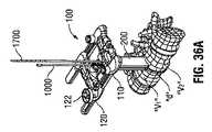 リトラクタシステム100は、リトラクタブレート200が腰筋に実質的に横断的である状態で整列すると、図35Aおよび図35Bに示すように、隣接する椎体上に頭側リトラクタブレードが配設されるように、部分的に開口するよう移動または牽引される。任意選択で、1つまたは複数の固定ピン1000(図21)は、図36Aおよび図36Bに示すように、リトラクタブレート200のチャネル209の1つまたは複数を通って導入され、固定ピンドライバ1200(図22)を使用して椎骨「V1」内に進められる。好ましくは、固定ピン1000は、骨構造にしっかりと係合するためのネジ1020が切ってある遠位部、および、固定ピン1000を挿入または除去するための、固定ピンドライバ1200に動作可能に結合されるヘッド1040を有する。頭側ブレードが頭側椎骨「V1」に固着された状態で、図37に示すように、ノブ122が作動されて、第1の支持体110を第2の支持体120から離す。しかし、第1の支持体110が頭側椎骨「V1」に固着された状態で、ノブ122が作動されて、第2の支持体120を第1の支持体110から離すことも企図される。摺動可能クランクアーム123(図1)は、さらなるクランク用レバレッジ(cranking leverage)のためにノブ122から外に延在することができる。第1の支持体110が第2の支持体120から離されるため、図38Aおよび図38Bに示すように、第2のアームに関連するラチェットは、ラチェット歯136に係合して、第1の支持体110が、牽引された組織からの圧力下で第2の支持体120の方に戻ることを防止する。リトラクタシステム100は、椎間板「d」の適切なアクセスおよび可視化が得られるまで開口される。さらなる軟部組織牽引が所望される場合、リトラクタシステム100の側方態様のための補助ブレード400を使用することができる。特に、補助ブレード400は、切開に挿入され、アーム130、132に沿って後方に引出され、ロック用ホイール135、137を回転させることによって所定場所にロックされる。ブレードの凹状遠位先端は、対応する椎骨「V1」、「V2」の側面の曲率に実質的に一致する。この形状は、有利には、手術チャネルの一部分を塞ぐ、ブレード先端の下での軟部組織クリーピングを最小にする。固定ピン1000は、椎体に接して所定位置に遠位ブレード先端を保持するように、椎骨「V1」、「V2」に対してブレード200を固定するのを補助し、それにより、リトラクタシステム100が手術中にレバレッジされ操作されるときに、牽引された組織が、手術野に入るようにブレード200の下を摺動しないことを保証する。When the