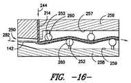 [0061]図4及び図13〜17に示されているように、態様によっては、含浸ゾーン250は、二つの相隔たって対立するプレート256と258の間に画定される。第一のプレート256は第一の内部表面257を画定し、第二のプレート258は第二の内部表面259を画定する。含浸ゾーン250は第一のプレート256と第二のプレート258との間に画定される。接触面252は、第一及び第二の内部表面257と259の両方の上で画定されるか、若しくはその両方から伸長するか、または第一及び第二の内部表面257と259の一方のみの上で画定されるか、若しくはそこから伸長することができる。  [0061] As shown in FIGS. 4 and 13-17, in some embodiments, the