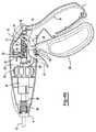 図2Aは、鉗子2の分解図を示している。鉗子2は、ノーズコーン4を備える。鉗子2は、把持機構を形成するために互いに取り付けられているジョー22およびジョー支持ロッド24を備える。鉗子2は、切断機構を形成するために互いに取り付けられ得るブレード32およびブレード支持ロッド34を備える。把持機構および切断機構は、中空管12に通して挿入され、テーパ付きオーバーモールド部分13がスタイレット10を形成し得る。中空状の管12は、遠位端14と近位端16とを有する。復帰機構86、停止デバイス88、回転ホイール82、スプール操作ブロック62、アンカー操作ブロック63が、回転機構80のすべての部分である。スタイレット10は、回転機構80に通して挿入され得る。貫通されたブレード支持ロッド34の端部において、回転機構80は、付勢デバイス75、シャトル(往復部材)72、ソケット(係合部)74のハウジング、およびベアリングフィッティング(口金)64を備える。スタイレット10、回転機構80、および付勢デバイス75、シャトル72、ソケット74は、スタイレットサブアセンブリを形成する。鉗子2は、単一のカムフィンガ68を有する締め付けレバー66、ならびにアーム69およびカムスロット70を有する切断トリガレバー67を備える。締め付けレバーおよび切断トリガレバーは、1つ以上の枢軸(ピボット)79に取り付けられ得る。締め付けレバー66、および切断トリガレバー67、シャトル72およびソケット74、ベアリングフィッティング64および移動ピン76は、作動機構60を備える。鉗子2は、2つのハウジング構造体52を備える。ハウジング構造体52は、ウェブ構造体78、1つ以上の枢軸79、および1つ以上のガイドリッジ(ガイド壁)77を備える。  FIG. 2A shows an exploded view of the