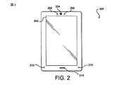 図2は、様々な実施形態に従って使用され得る計算デバイス例200を例示する。この例において、デバイスは、デバイスの、表示要素202と同じ側面上に従来のデジタルカメラ204を有しており、ユーザが少なくとも部分的に表示要素の前にいる典型的な動作の間に、デバイスがデバイスのユーザについての画像情報を取り込むことを可能にする。加えて、相対的に同じ位置におけるときにユーザからのジェスチャー入力を決定するために使用され得るデバイスの同じ側面上に位置付けられた2つのジェスチャーセンサ210、212がある。例えば、デバイスに関して任意の所望の方向もしくは位置からのジェスチャーまたは画像入力を可能にし得るような、追加的なカメラ、ジェスチャーセンサ、あるいは他のそのような要素が、様々な実施形態の範囲内においてデバイスの同じもしくは他の側面または位置上にも同様にあり得ることが理解されるべきである。カメラおよび少なくとも1つのジェスチャーセンサは共に、様々な状況において、例えば、デバイスが、(複数の)ジェスチャーセンサを使用して長期間にわたって比較的低い電力におけるジェスチャー認識を可能にして、従来の、より高い解像度のカメラを使用して特定の時間において顔面認識または他のプロセッサおよび電力集約的処理を行うことを望む場合などにおいて、有利に使用され得る。  FIG. 2 illustrates an