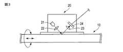 図3に示すように、状態検出器20は、少なくとも、光を挿入部材10に向けて照射する光源部21と、光源光を集光する投光レンズ22と、挿入部材10の表面で反射した反射光を集光する受光レンズ23と、受光レンズ23を通過した光を検出する光学パターン検出器24と、を有している。  As shown in FIG. 3, the