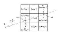 同様に、(x0+1)列の画素と直線y=(1/3)xとの交点A6の座標を与えるベクトルCA6は、中心Cから画素A1、A5にそれぞれ向かうベクトルCA1、CA5とを用いて、式(6−1)によって算出される。また、交点A6における深度Z(A6)は、画素A1、A5における深度Z(A1)、Z(A6)を用いて、式(6−2)によって与えられる。