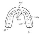 前記歯科用カバー層は、好適には、十分軟質の材料で形成された円周縁を有し、この縁が上側及び下側の歯槽の歯茎隆起線の側に対抗して快適に適合すべく圧迫及び変形するように構成される。このため、これら縁は、前記キャビティ内に含有される歯の冠状部を有する(例えば、歯科用カバー層のウェルから形成される)密閉されたキャビティを形成しうる。 The dental cover layer preferably has a circumferential edge formed of a sufficiently soft material, and this edge is compressed to fit comfortably against the upper and lower alveolar ridge line sides. And configured to deform. Thus, the edges may form a sealed cavity (e.g., formed from a well of a dental cover layer) having a tooth crown contained within the cavity.