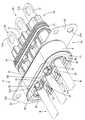 バックリテーナ40は、図7乃至図10に示すように、一対の半割体41を上下方向に互いに組み付けて構成されており、各半割体41の一方の端部が互いにヒンジ42によって連結されている。また、バックリテーナ40は、各電線Wを支持する複数(本実施形態では3つ)の支持部43と、複数の支持部43を左右方向に横並びに一体に連結する連結部44とを備えて構成されている。  As shown in FIGS. 7 to 10, the