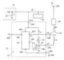 トランジスタMbは、ノーマリーオフ形で、かつ、トランジスタMaと相補となるP型MOSFETが用いられる。トランジスタMbは、低圧側電極であるドレインDがノード40に接続され、高圧側電極であるソースSが、電源端子24Aに接続されている。  The transistor Mb is a normally-off type P-type MOSFET that is complementary to the transistor Ma. In the transistor Mb, the drain D, which is a low-voltage side electrode, is connected to the