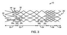 図3は、セル30の複数の外周バンド44を有するケージ10の平面図である。各セルは、近位部分34a、中心部分34bおよび遠位部分34cを有するセル壁34により形成された四角形である。各セル壁34は、複数のストラット36により形成されている。少なくとも図示の実施形態において、セル壁34は、近位のストラットペア38および遠位のストラットペア40を有する。近位のストラットペア38は近位の頂角46を有し、近位のストラットペアは近位の頂角48を有する。  FIG. 3 is a plan view of the