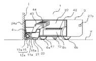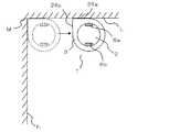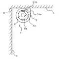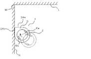 図4、5に示すように、外殻部3は、中央部2に対して回転可能に連結される。中央部2は、外殻部3の内部に配置され、外殻部3との連結部には複数の円柱状の転がり部材56が設けられる。外殻部3の中央部2に対する回転可能角度は、90°であり、外殻部3は、中央部2の周りを、図5に示す状態に対して時計回り、反時計回りにそれぞれ45°の範囲で回転する。(Outer shell drive system)