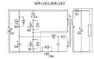 図5Bには、定常時(図1の期間A)において、スイッチング素子Q1がターンオフ(オフ)したときの電流の流れを示している。図5Aの状態でスイッチング素子Q1をターンオフすると、図5Bに示すように、スイッチング素子Q1を流れていた電流は、スイッチング素子Q1を流れることができなくなるため、スイッチング素子Q2の寄生ダイオードへと転流し、後記する図6に示すIQ2の波形のように、スイッチング素子Q2の電流は大きくマイナス側に振れることとなる。 FIG. 5B shows a current flow when the switching element Q1 is turned off (off) in a steady state (period A in FIG. 1). When the switching element Q1 is turned off in the state of FIG. 5A, the current flowing through the switching element Q1 can no longer flow through the switching element Q1, as shown in FIG. 5B, and is commutated to the parasitic diode of the switching element Q2. As shown in the waveform of IQ2 shown in FIG. 6 to be described later, the current of the switching element Q2 greatly fluctuates on the negative side.